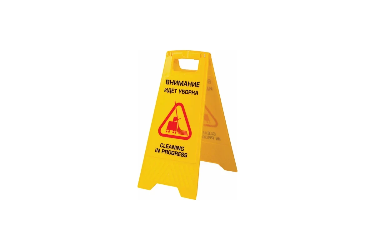 Пластиковый знак-табличка "Проводиться уборка". Предназначен для привлечения внимания и обеспечения безопасности в местах массового скопления людей. Выставляется при проведении влажной уборки, натирки напольных покрытий и т.п.. Табличка выполнена из ударопрочного материала ABS, легко складывается и раскладывается. Информация на трёх языках ( казахском, русском и английском языках ).Размещаются данные знаки-таблички в общественных местах: торговых и бизнес центрах, ресторанах, офисных зданиях и т.д.